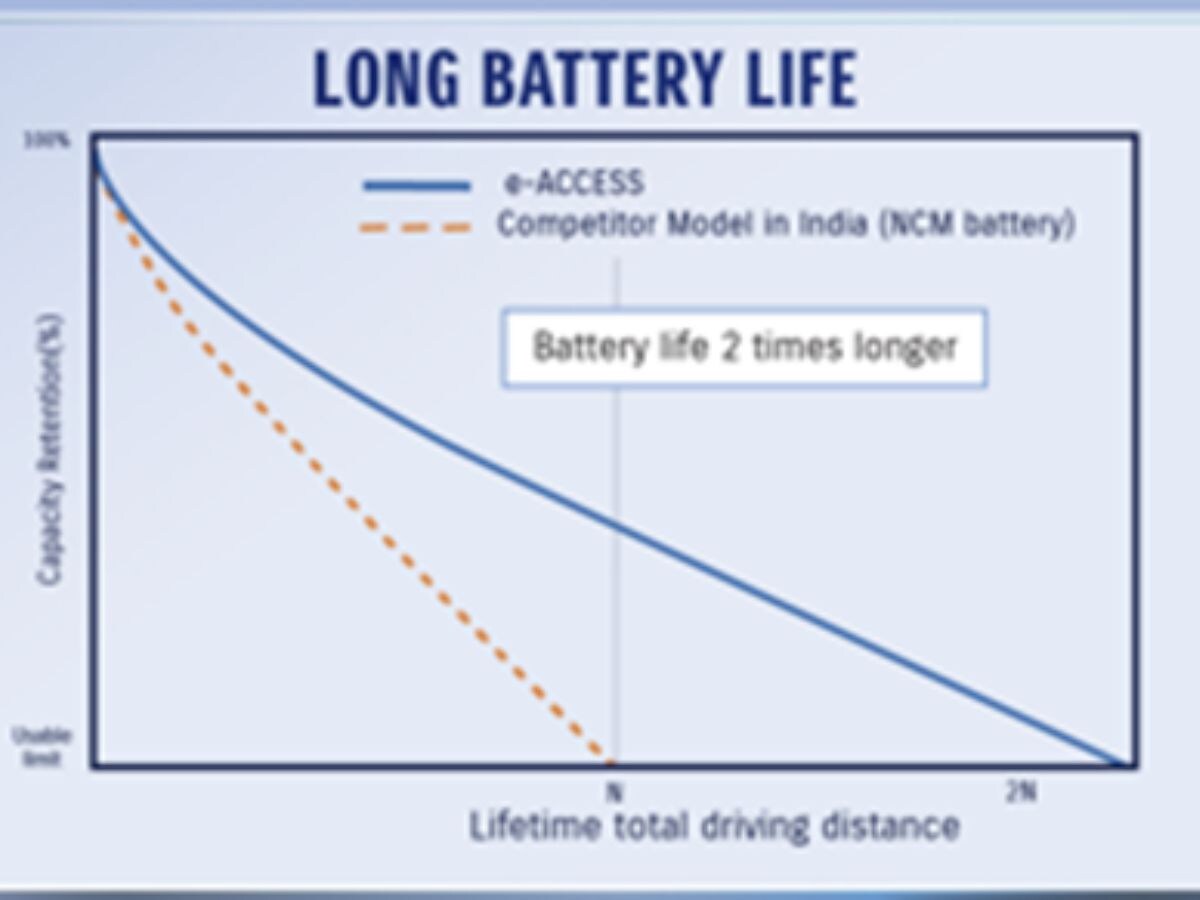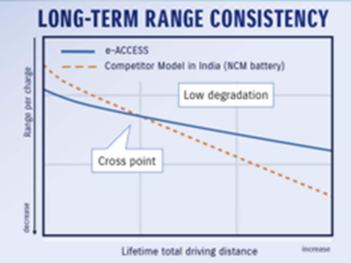 NMC ಮತ್ತು LFP ಬ್ಯಾಟರಿಗಳು ದೀರ್ಘಾವಧಿಗಳಲ್ಲಿ ಎಷ್ಟು ಕಾರ್ಯಕ್ಷಮತೆಯನ್ನು ಪ್ರದರ್ಶಿಸುತ್ತವೆ ಎಂಬುದು ಈ ಗ್ರಾಫ್ನಿಂದ ತಿಳಿದುಬರುತ್ತದೆ. ಕೆಂಪು ಬಣ್ಣದ ಚುಕ್ಕೆಗಳ ರೇಖೆಯು (NMC) ಆರಂಭದಲ್ಲೇನೋ ಜಾಸ್ತಿ ರೇಂಜ್ ಕೊಡುತ್ತದೆ, ಆದರೆ ಆದರೆ ನೀವು ಹೆಚ್ಚು ಹೆಚ್ಚು ಡ್ರೈವ್ ಮಾಡುತ್ತಿದ್ದಂತೆಯೇ, ಅದರ ರೇಂಜ್ ತುಂಬ ವೇಗವಾಗಿ ಕಡಿಮೆಯಾಗತೊಡಗುತ್ತದೆ. ಇನ್ನೊಂದೆಡೆ, Suzuki e-ACCESS ನ LFP ಬ್ಯಾಟರಿ (ಕಡು ನೀಲಿ ರೇಖೆ) ಸ್ವಲ್ಪ ಕಡಿಮೆ ರೇಂಜ್ನೊಂದಿಗೆ ಆರಂಭವಾಗಿಯೂ ಸಮಯ ಸರಿದಂತೆ ತನ್ನ ರೇಂಜ್ ಅನ್ನು ಹೆಚ್ಚು ಬಲಿಷ್ಠವಾಗಿ ಹಾಗೂ ನಿರಂತರವಾಗಿ ಕಾಪಾಡಿಕೊಳ್ಳುತ್ತದೆ.